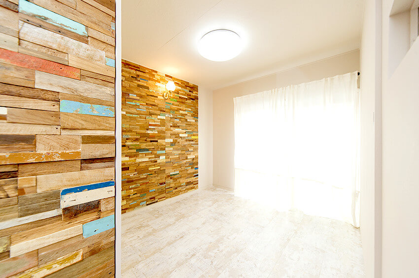 借り手がいない古い賃貸住宅を、リノベーションでよみがえり!築年数ある家に合わせて古木材を使った壁のデコレーションがアクセント。